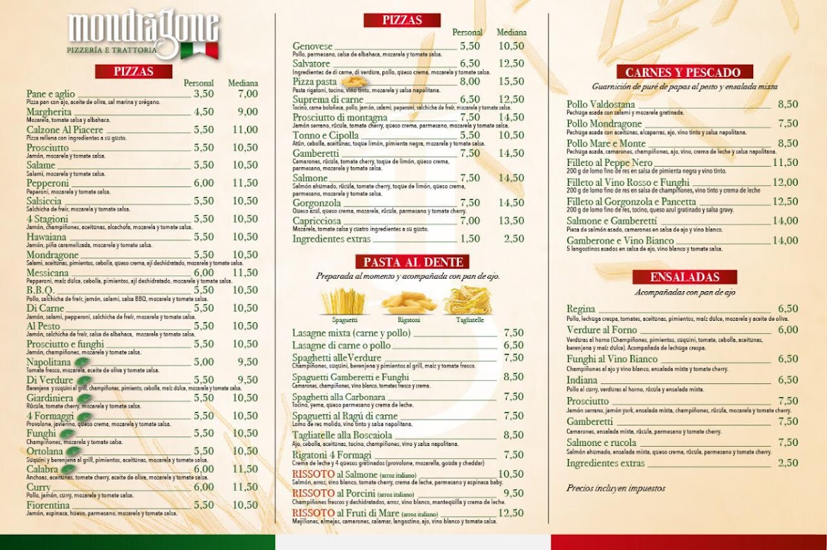 The menu at Mondragone Pizzeria in Loja, Ecuador, offers a delightful selection of Italian-inspired dishes, perfect for those craving authentic pizza and pasta. Among the standout options, Pizza Prosciutto combines the richness of prosciutto with a perfectly baked crust, creating a satisfying dish for any pizza lover. Another must-try is the Pizza Mondragone Y 4 Quesos, a four-cheese pizza that delivers a creamy, cheesy experience with every bite.